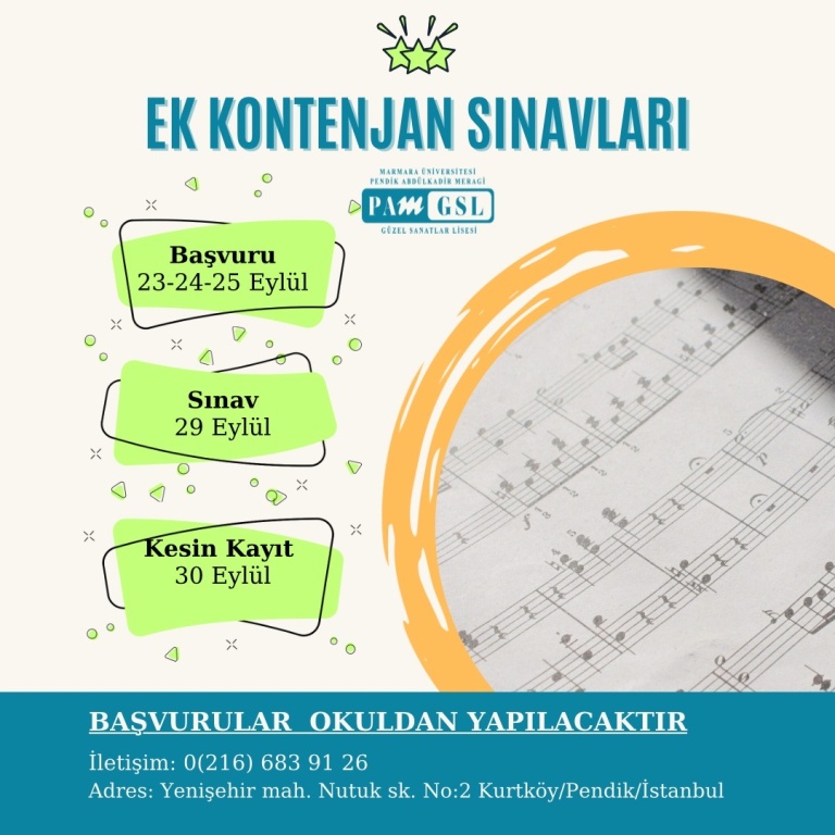 Ek Kontenjan Sınav Duyurusu Marmara Üniversitesi Pendik Abdülkadir Meragi Güzel Sanatlar Lisesinde yeteneklerini katlamak ister misin? Başvuru Tarihleri: 23 – 24 - 25 Eylül Sınav Tarihi: 29 Eylül Kesin Kayıt: 30 Eylül Sanat yolculuğuna bizimle başlamak için başvurunu belirtilen tarihlerde tamamlamayı unutma! Detaylı bilgi için www.pgsl.meb.k12.tr Sanatla geleceğini şekillendir!